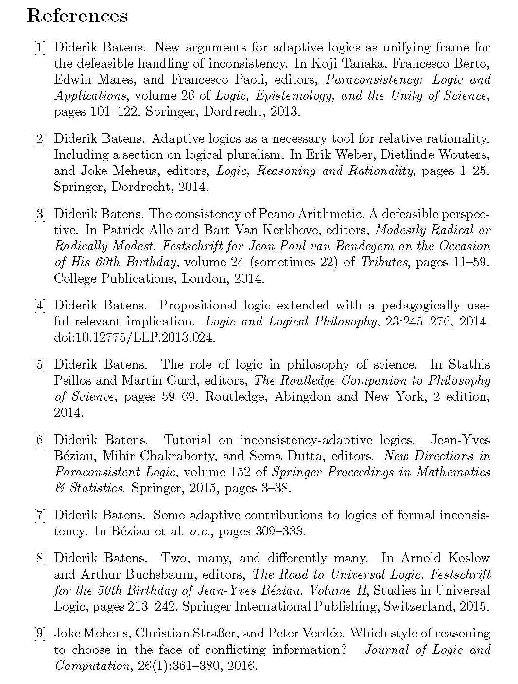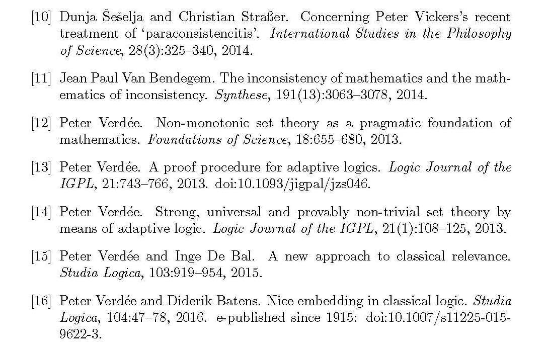 2) How did you develop your work on paraconsistent logic? It seemed to me that a rather fundamental problem had not been solved or even raised, viz.\ to define a logic that is just like CL, except that it is paraconsistent. So this was the first task I set myself in the domain, combining it with the study of logics between the basic paraconsistent logic and CL, including maximal paraconsistent logics. Many paraconsistent logics from the literature could be ordered in a hierarchy---some turned out to rest on rather arbitrary choices. The 1980 version was merely propositional, but the predicative version of several logics was studied later, especially that of the basic logic CLuN. The resulting insights struck me as unexpected and instructive. An example is that, if negation is paraconsistent, Modus Tollens fails for material implication. If one wants Modus Tollens, one has to add it, or define a stronger implication than the material one. My interest in applications, especially to the philosophy of science, rather than in so-called principles, brought me to inconsistency-adaptive logics. Their proofs display a typical dynamics. It originates when a contradiction is presumed to be false unless and until proven otherwise. The idea required elaboration: inconsistencies have to be minimized in a systematic and formal way. Inconsistency-adaptive logics kept me fascinated to this day. Once inconsistency is detected, they are a necessary step towards restoring consistency. Even more fascinating is that the structure can be generalized to adaptive logics in standard format, which I take as a viable approach to all realistic forms of defeasible reasoning. Incidently, the great enmity, sometimes rabidity, of many classical logicians towards paraconsistency was a great encouragement to continue in the wrong direction. |